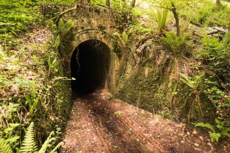 Follow to the left of the sandstone gulley with a stream running through the woods. Pass a brick-lined drainage and access tunnel, go straight up this path, away from the brook.