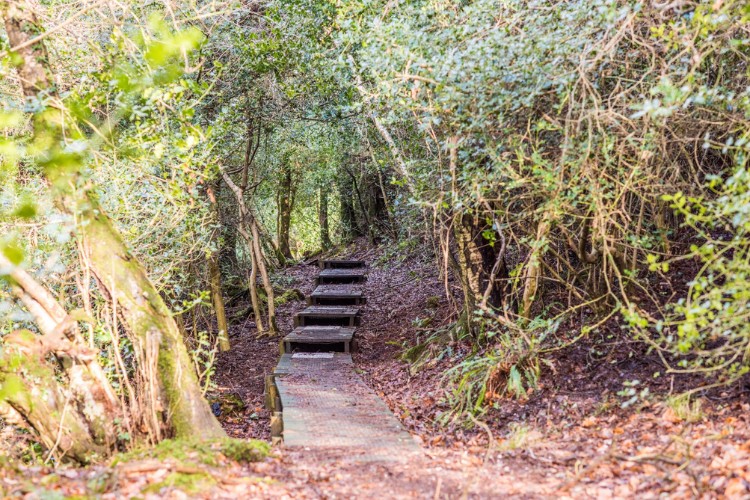 Go into a field on to a woodland edge, with the land rising up to your right; through the field to a gate into an enchanting conservation woodland. There is a boardwalk through part of it and it can be quite boggy elsewhere. Go through the gate at the end and on into another woodland.