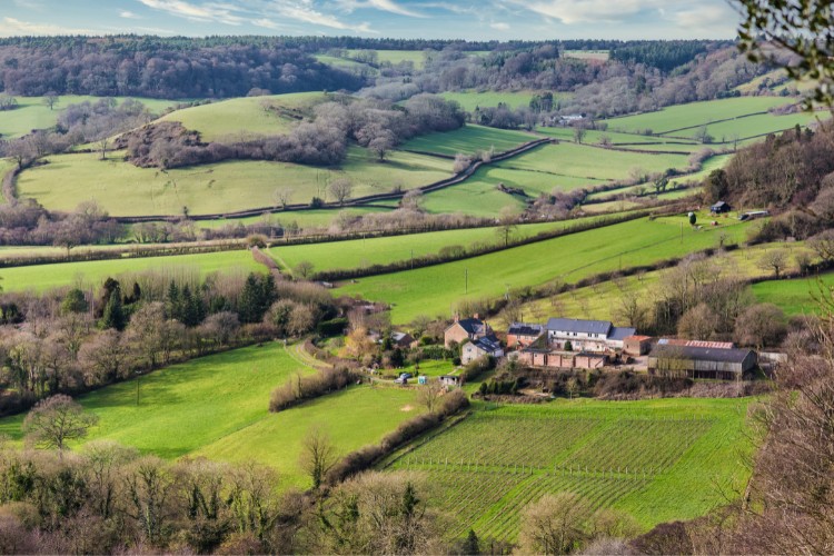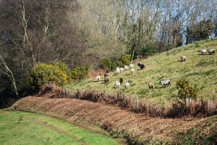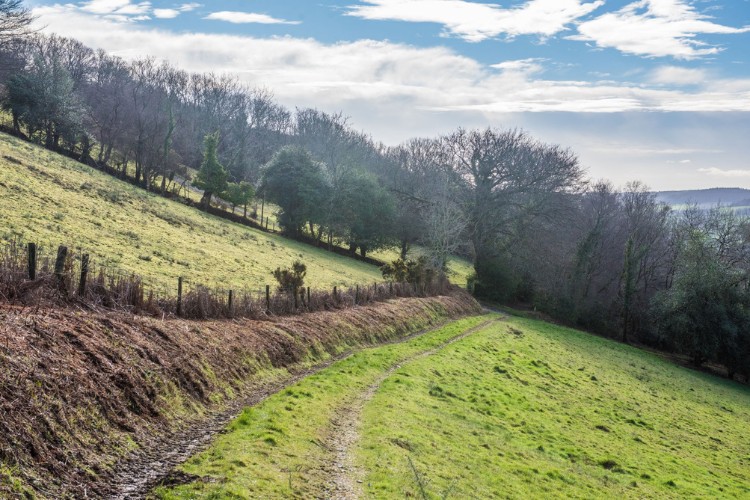 Harcombe valley drops down to your right. Turn left (SW), downhill, along the tarmac lane at the T-junction. In front of you see the valley and great views of Devon’s patchwork fields.
